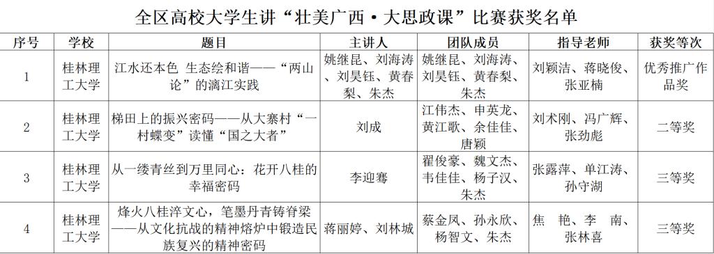 我院参赛作品《江水还本色 生态绘和谐——“两山论”的漓江实践》荣获优秀推广作品奖,《梯田上的振兴密码——从大寨村“一村蝶变”读懂“国之大者”》获二等奖,《从一缕青丝到万里同心:花开八桂的幸福密码》和《烽火八桂淬文心,笔墨丹青铸脊梁——从文化抗战的精神熔炉中锻造民族复兴的精神密码》荣获三等奖。