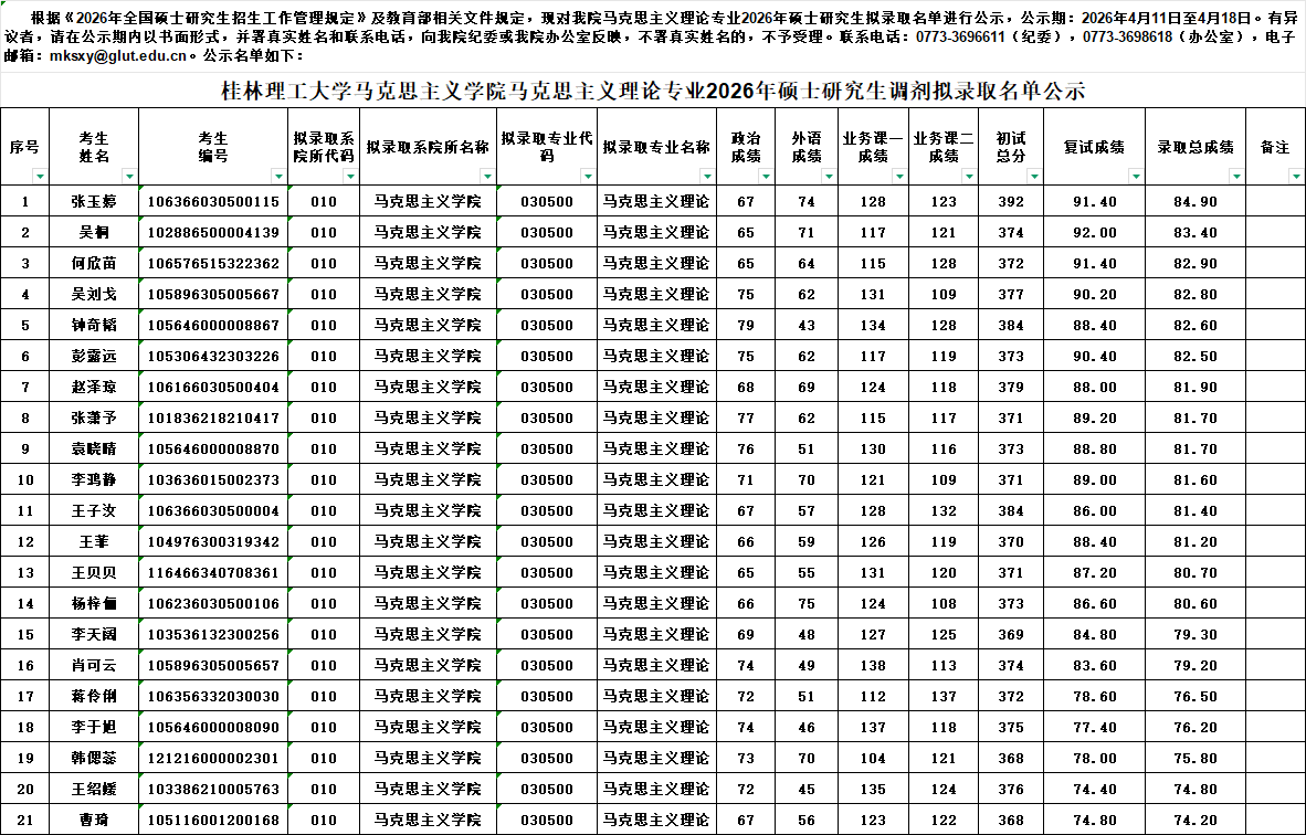 根据教育部及我校相关文件规定,现将bv伟德国际1946复试拟录取名单(调剂)进行公示。公示期7日,如考生对复试录取名单有异议,请与我院办公室联系,联系电话0773-3698618。