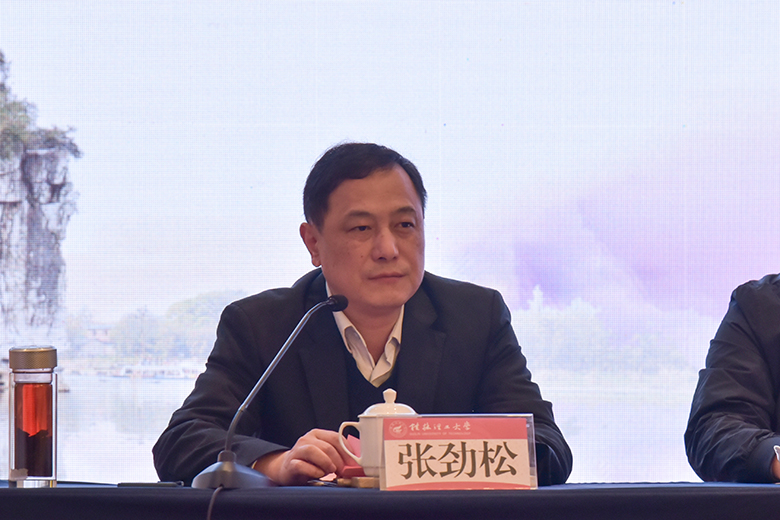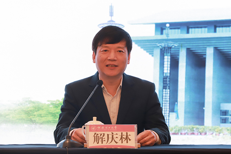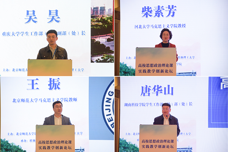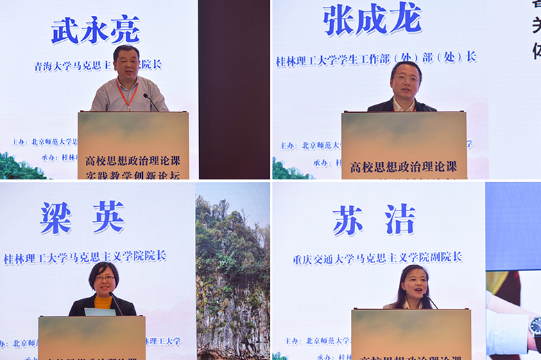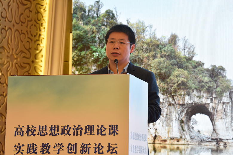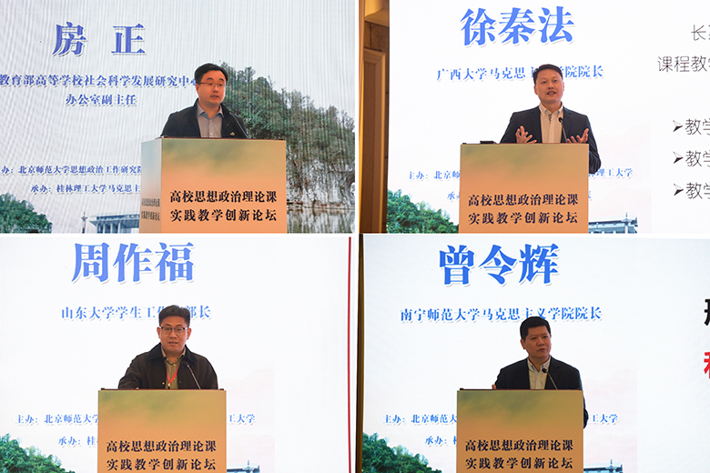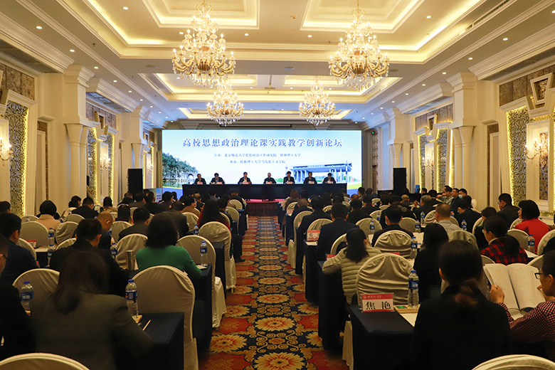 为扎实推进习近平新时代中国特色社会主义思想“三进”工作,落实教育部关于加强高校思想政治理论课建设的要求,有效推动高校思想政治理论课实践教学的创新发展,4月10日,高校思想政治理论课实践教学创新论坛暨“教育部高校示范马院和优秀教学团队建设重点项目”成果发布会在桂林大公馆成功举办。此次大会由我校和北京师范大学思想政治工作研究院共同主办、我院承办,北京师范大学思想政治工作研究院院长冯刚,教育部高等学校社会科学发展研究中心办公室副主任房正,自治区党委教育工委宣传部部长、教育厅思想政治工作处处长赵益真,《学校党建与思想教育》杂志社社长谢成宇,我校党委书记李国忠、校长解庆林、副校长邓国彬出席会议,来自北京师范大学、重庆大学、山东大学、广西大学等区内外40余所高校的专家学者、师生代表共100余人参加了会议。开幕式由我校原副厅级调研员张劲松主持。