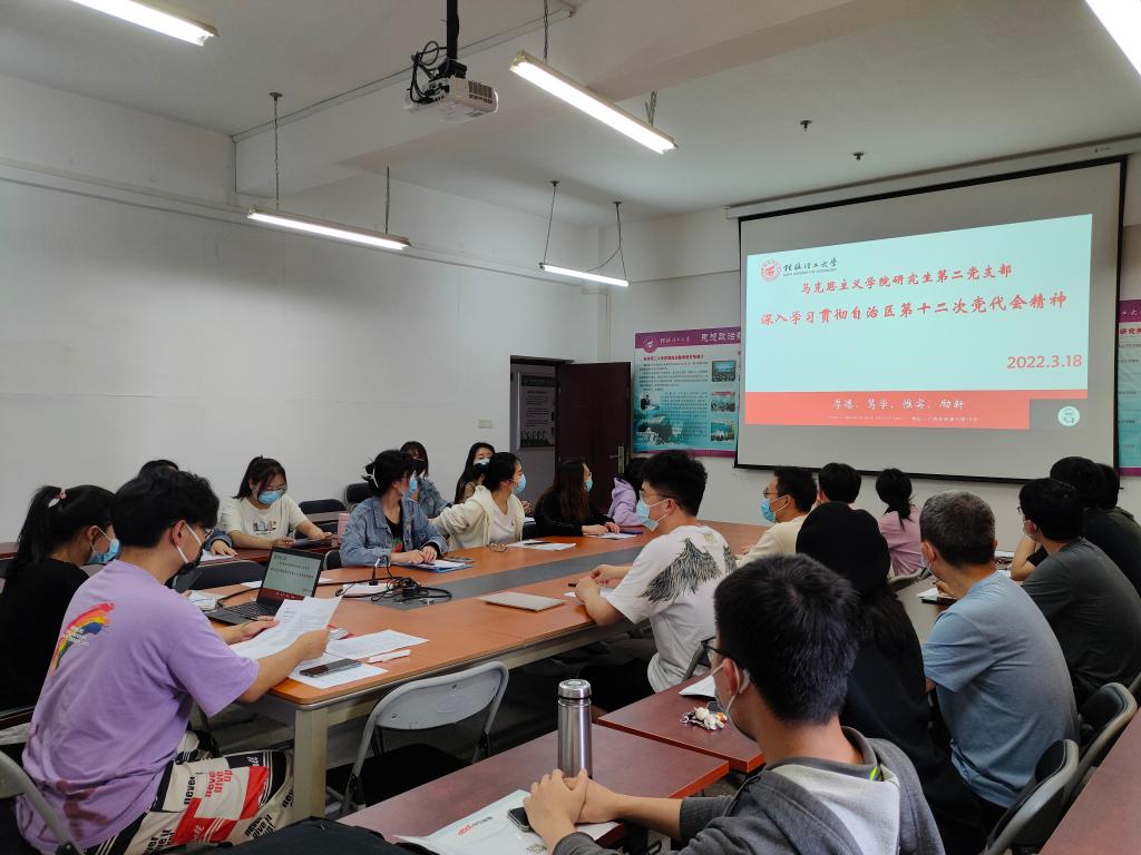 为深入学习贯彻中国共产党广西壮族自治区第十二次代表大会精神,3月18日下午,研究生第二党支部在雁山校区07407教室开展了学习刘宁在中国共产党广西壮族自治区第十二次代表大会上的报告精神的专题党课。党支部全体党员通过线上、线下相结合的方式参加了此次活动,会议由党支部书记蒋建主持。
