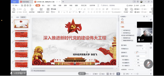 为深入学习贯彻党的二十大精神、研究党建理论,12月14日晚,对外经济贸易大学bv伟德国际1946教授、博士生导师张世飞以线上方式为我院师生作题为“深入推进新时代党的建设新的伟大工程”的辅导报告,报告由学院副院长吴杨义主持。