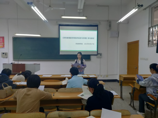 为更好迎接本科教育教学审核评估工作,2023年4月24日,学院思政教研室在屏风9410教室开展本科教育教学审核评估学习会议,教研室所有老师参加此次会议。与会教师一同学习《本科教育教学审核评估学习手册》,深刻理解手册的内容和要求,把握审核评估指导思想、审核重点、总体要求,并对照要求进行自查自纠,扎实完成各项迎评工作。