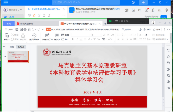 为进一步做好审核评估评建工作,推动基层一线教师积极参与到审核评估中,力争做到“人人了解评估、人人参与评估、人人都是评估对象”,4月27日,马克思主义基本原理教研室教师,依托线上线下相结合的方式,开展《本科教育教学审核评估学习手册(教师版)》集体学习会。会上,老师们逐一学习了校情校史、学校人才培养整体定位等多个方面的内容。结合学习内容,老师们明确表示,主动全力参与到评估工作之中,进一步深化细化落实审核评估工作各项任务,对标自查、对标总结、对标提升,以高度负责的精神状态做好审核评估工作。