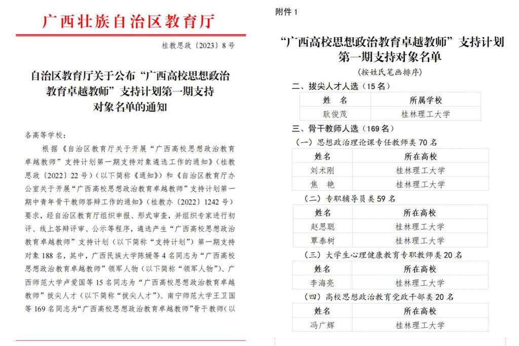 近日,自治区党委教育工委、自治区教育厅公布“广西高校思想政治教育卓越教师”支持计划第一期支持对象名单,我校bv伟德国际1946党委书记耿俊茂入选“广西高校思想政治教育卓越教师”拔尖人才人选,bv伟德国际1946教师焦艳、刘术刚入选“广西高校思想政治教育卓越教师”骨干教师人选(专任教师),材料科学与工程学院团委书记赵思聪、商学院团委副书记覃泰树入选“广西高校思想政治教育卓越教师”骨干教师人选(专职辅导员),学生工作部(处)部(处)长冯广辉入选“广西高校思想政治教育卓越教师”骨干教师人选(党政干部),学生工作部(处)部(处)心理健康教育与咨询中心主任李海亮入选“广西高校思想政治教育卓越教师”骨干教师人选(大学生心理健康教育专职教师)。