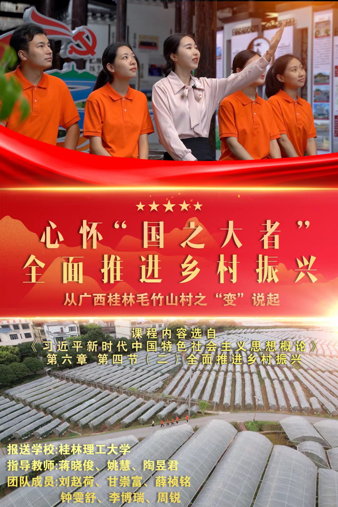 近日,“新思想引领新征程·新青年建功新时代”第七届全国高校大学生讲思政课公开课展示活动评选结果公布,我院遴选参赛的“行走的思政课”作品《心怀“国之大者” 全面推进乡村振兴——从广西桂林毛竹山村之“变”说起》(学生成员:刘赵荷、甘崇富、薛祯铭、钟雯舒、李博瑞、周锐;指导教师:蒋晓俊、姚慧、陶雁羽)经过省赛到国赛的层层角逐,最终获得本科组一等奖。我院在该竞赛活动中实现了全国奖项的新突破,充分展现了新时代我校大学生的马克思主义理论素养和时代精神风貌。