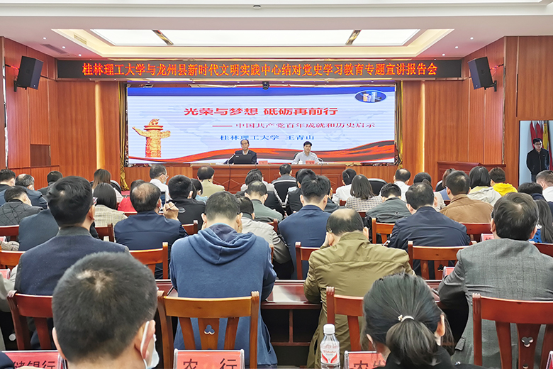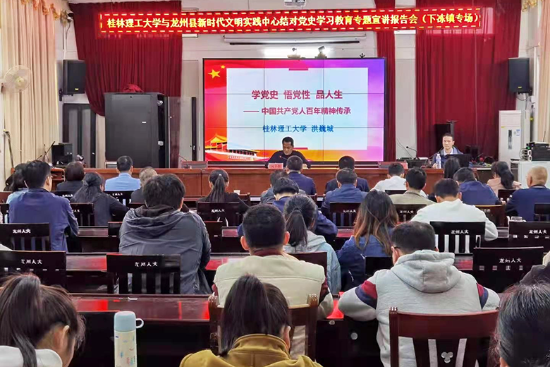 为庆祝中国共产党百年华诞,深入贯彻落实学校“我为群众办实事”实践活动精神,4月9日,我院教师一行赴崇左市龙州县(即龙州起义所在地)开展党史学习教育专题宣讲报告会。报告会由学院王青山教授和洪巍城副教授主讲,龙州县政府和下冻镇200余名党员干部参加了讲座。