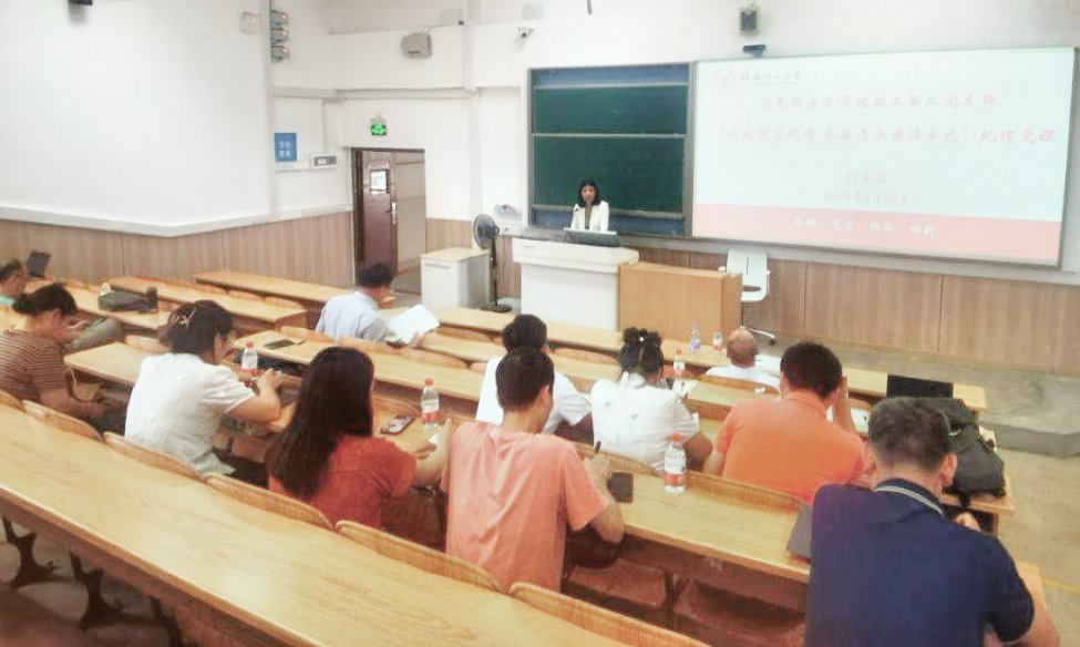 6月28日下午,学院副院长刘金菊同志在雁山校区07320室为学院教工第二党支部党员讲授党纪学习教育纪律党课。她结合实际,重点就《中国共产党纪律处分条例》中的群众纪律、工作纪律、生活纪律方面的内容进行解读。