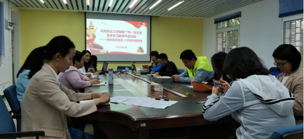 为了深入贯彻落实习近平总书记在党史学习教育动员大会上的讲话精神,营造“学党史、悟思想、办实事、开新局”的浓厚氛围,引导教师党员真正做到学史明理、学史增信、学史崇德、学史力行,5月18日下午,我院教工第一党支部在屏风校区11106会议室开展了“学好百年党史 上好高校思政课”党史学习教育专题活动。活动由党支部书记焦艳主持,支部全体教师党员参加。