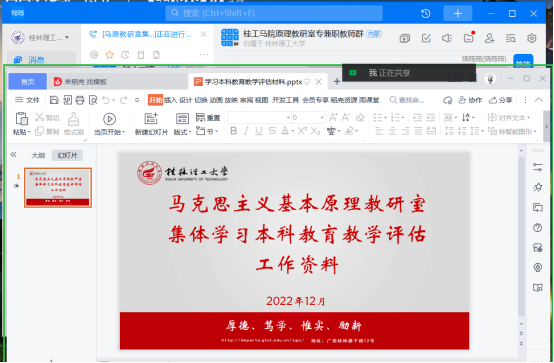 为进一步做好审核评估评建工作,推动基层一线教师深入理解新一轮教育教学审核评估相关知识,力争做到“人人了解评估、人人参与评估、人人都是评估对象”,12月20日,马克思主义基本原理教研室全体教师,依托线上会议的方式,开展《伟德国际1946手机本科教育教学评估学习手册》学习交流会。会上,结合学习内容,老师们陆续发言并明确表示,在日常教学工作中,将着力推进思政课教学“立德树人”的根本任务,把人才培养质量要求落实到课堂,特别是学生的学习成效上;将结合桂工特色,将校园文化、典型事迹融入教学中,扎实培养德智体美劳全面发展的社会主义建设者和接班人,为党育人、为国育才,确保学生真学、真信、真用。