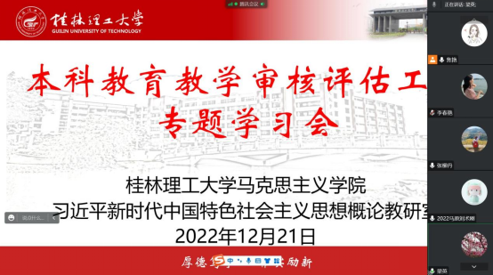 为系统推进本科教育教学审核评估工作,准确把握审核评估方案的精神和要求,12月21日晚上,习近平新时代中国特色社会主义思想概论教研室召开本科教育教学审核评估学习线上会议,教研室全体教师参加了学习。